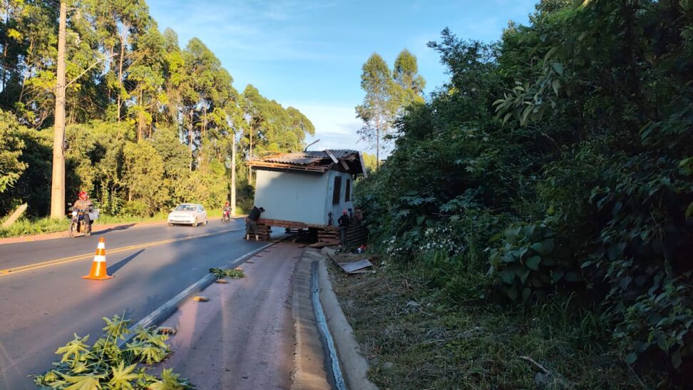 Uma casa que estava sendo transportada inteira em um caminhão caiu na madrugada desta sexta-feira (24), no Contorno Oeste de Chapecó, no Oeste catarinense. O incidente ocorreu quando o veículo fazia uma curva e a estrutura acabou pendendo e tombando parcialmente sobre a via.