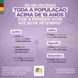 Em vídeo publicado nas redes sociais, o governador Eduardo Leite destacou a boa notícia. “Temos, sim, a perspectiva de poder vacinar toda a população adulta do RS até o final do mês de setembro com a primeira dose. O RS é o Estado que mais vacina sua população. Estamos sempre no topo do ranking e somos o Estado que tem maior percentual da população com as duas doses da vacina. Essa é uma corrida em que todos ganham, e no Rio Grande do Sul, vamos continuar trabalhando para proteger sempre a nossa população”, enfatiza Leite.