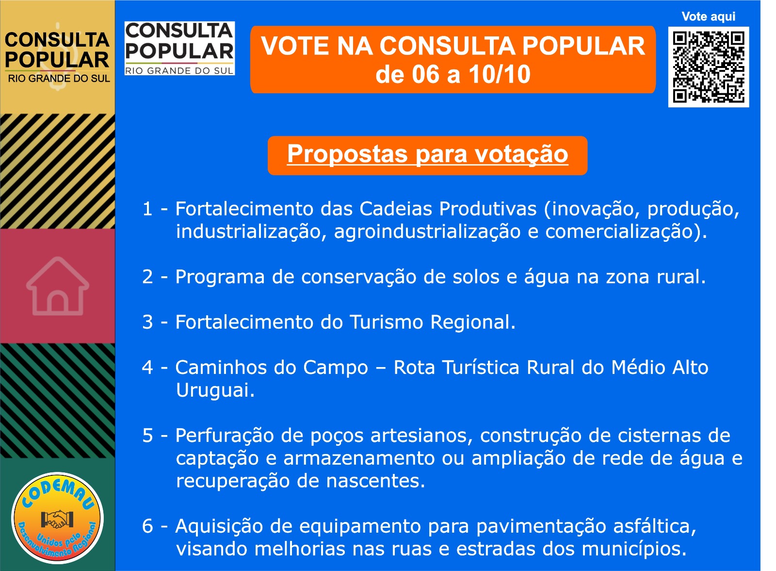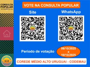 A votação da Consulta Popular 2025 terá início na segunda-feira (6/110). Essa é a última etapa do processo participativo, pelo qual são definidas prioridades regionais que serão incorporadas ao Orçamento do Estado. Além do portal on-line, os cidadãos poderão usar o aplicativo WhatsApp, por meio do número (51) 3210-3260, para eleger as ações que consideram essenciais. Das 6 demandas constantes na cédula, as 3 mais votadas serão eleitas.
