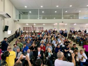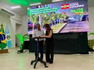 Na tarde da última sexta-feira, 10, nas dependências da Câmara Municipal de Vereadores de Palmitos, a Prefeita Giovana Giacomolli, acompanhada do Presidente da Câmara de Vereadores, Daian Böeck, recepcionaram o Governador de Santa Catarina, Jorginho Mello. O evento contou ainda com a presença de oito prefeitos dos municípios da região, lideranças regionais e municipais, além da imprensa local e regional. Na oportunidade, o governador Jorginho Mello anunciou a liberação de recursos para inúmeras obras no município de Palmitos. Numa entrevista coletiva, o governador e a prefeita Giovana concederam entrevista coletiva.